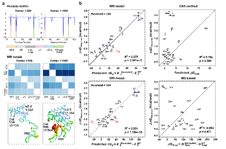 此外,为评估 NRI-MD的有效性和鲁棒性,该研究对 NRI-MD和其它分析方法(Hessian 矩阵分析、CNA 分析)进行比较。NRI-MD的轨迹分析方法有以下优点:(1)捕捉信号时效性更优,该模型能够在结构构象完全变化前(模拟早期)捕捉到传递至催化环(Cat. loop)的信号(图3a);(2)准确性更好,在预测氨基酸突变引发的相对自由能变方面,该模型计算的 ddG 值与实验值的相关性更高(图 3b)。此研究表明,NRI-MD相比于传统MD的分析方法,在时效性和信噪比方面具有显著的提升,对酶分子的设计、再改造以及对相关疾病的理解提供了全新思路。从长远来看,本研究对加深图机器学习在分子动力学模拟领域的应用具有重要意义,同时为获取隐藏在生物大分子功能下的高层次特征提供了一种高效的技术方法。