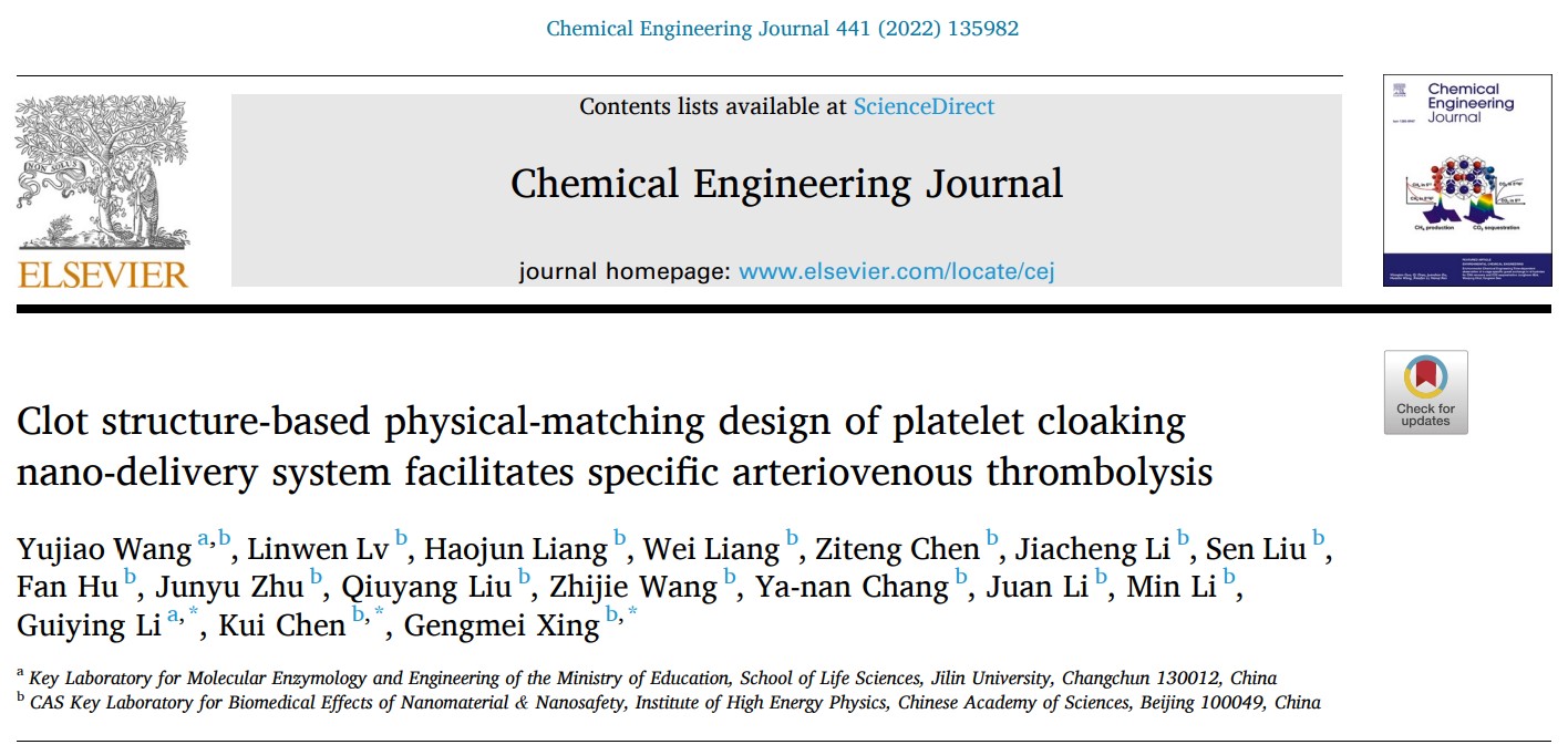 分子酶学工程教育部重点实验室李桂英教授团队与中国科学院高能物理研究所邢更妹研究员团队合作,通过调整血小板膜伪装递送系统的粒径,优化递送系统在动静脉血栓中的渗透性和滞留性,构建出物理匹配型血栓递送系统,实现了动脉静脉血栓的特异性溶栓治疗。相关研究成果以“Clot structure-based physical-matching design of platelet cloaking nano-delivery system facilitates specific arteriovenous thrombolysis”为题,于2022年8月1日正式发表在Chemical Engineering Journal。