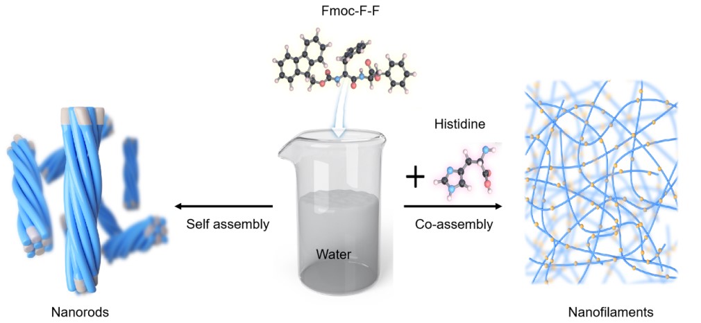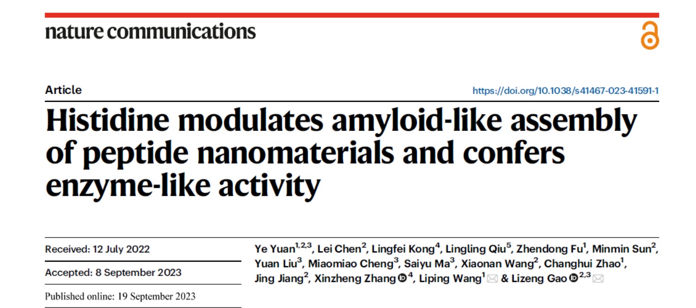 王丽萍教授研究团队联合中国科学院生物物理研究所的高利增教授研究团队以Fmoc-F-F为简约模型,发现组氨酸可以调节Fmoc-F-F的组装行为,诱导酶样催化。相关结果近日发表在Nature Communications上(Histidine modulates amyloid-like assembly of peptide nanomaterials and confers enzyme-like activity. Nature Communications, 2023, 14:5808.)