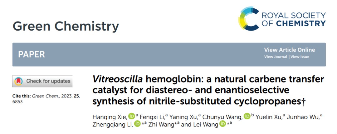 通过对血红蛋白结构和催化机制的进一步理解,课题组以血红蛋白具有的卡宾转移酶活力为基础,探索其在手性合成中的应用,结合分子对接技术多角度分析催化机制,以“Vitreoscilla hemoglobin: A natural carbene transfer catalyst for diastereo- and enantioselective synthesis of nitrile-substituted cyclopropanes”为题,在国际权威学术期刊《Green Chemistry》(影响因子9.8,中科院分区一区)在线发表研究论文。论文中报告了一种对环境友好的策略,将原位生成的重氮试剂与生物催化相结合,用于芳香烯烃的不对称环丙烷化。论文第一完成单位为性爱网站