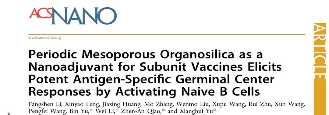 无机合成与制备化学国家重点实验室乔振安教授和复旦大学化学系李伟教授以周期性介孔有机硅(PMO)作为新型亚单位疫苗佐剂,揭示其通过CLR通路直接激活静息B细胞,在免疫后早期引发强效的生发中心反应,并最终诱导机体产生广谱且持久的体液免疫应答和强效的细胞免疫应答。研究论文“Periodic mesoporous organosilica as a nanoadjuvant for subunit vaccines elicits potent antigen-specific germinal center responses by activating naive B cells”发表在《ACS Nano》杂志(影响因子17.1,中科院分区一区)上。论文第一完成单位为性爱网站
