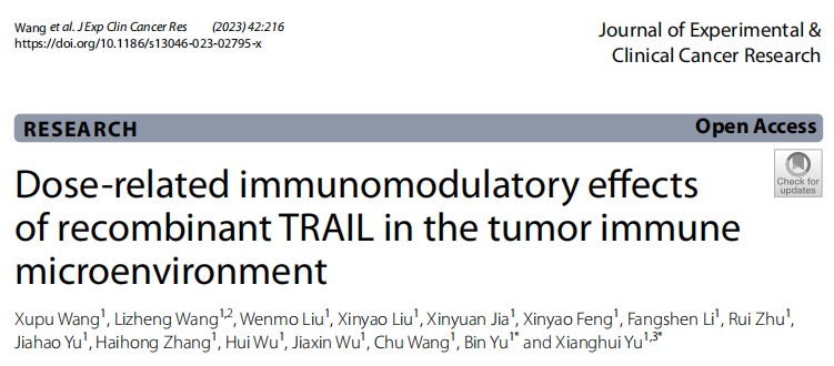 艾滋病疫苗国家工程实验室于湘晖、于彬团队报道了重组TRAIL在TME中扮演着剂量依赖的双向免疫调节作用,并详细阐释了作用机制。同时探讨了癌症治疗中重组TRAIL增强抗肿瘤免疫和抗肿瘤效应的潜在策略。研究论文“Dose-related immunomodulatory effects of recombinant TRAIL in the tumor immune microenvironment”发表在国际学术期刊《Journal of Experimental & Clinical Cancer Research》(影响因子11.3,中科院分区一区)上。论文第一完成单位为性爱网站