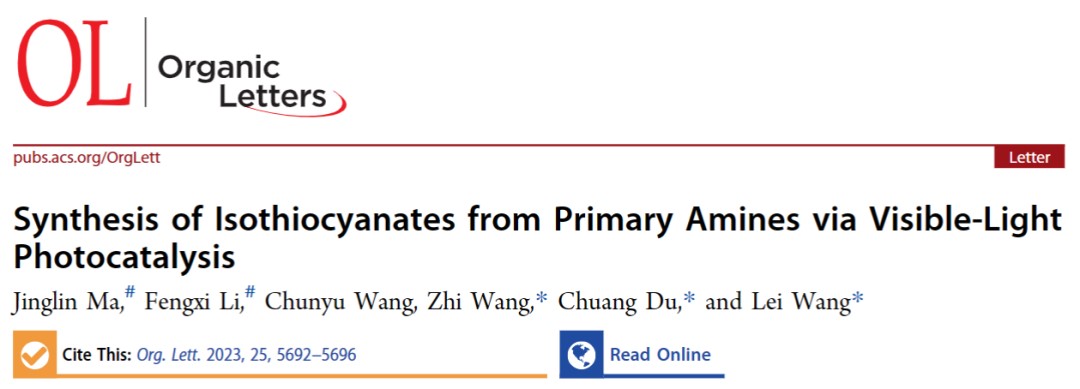 在对酶催化领域进行持续研究的同时,课题组也对光酶催化等新兴研究领域进行涉猎,通过搭建光催化实验装置和前期文献调研,对光催化合成研究有了一定的了解,以“Synthesis of Isothiocyanates from Primary Amines via Visible-Light Photocatalysis”为题,在国际权威学术期刊《Organic letters》(影响因子5.2,中科院分区一区)在线发表研究论文。论文中报道了一种以伯胺和二硫化碳为原料,光催化体系下,高效、温和地合成各种取代异硫氰酸酯的方法。该方法扩大了光催化的应用范围,并为制备脂肪族和芳香族异硫氰酸酯提供了一种新的策略,具有底物耐受范围广、对环境友好、可见光驱动的优点。论文第一完成单位为性爱网站