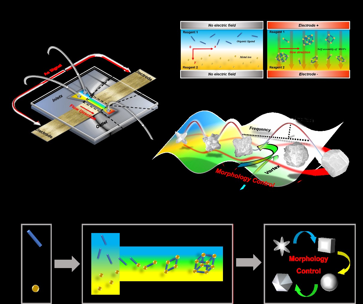 另一方面,金属有机框架(MOFs)具有灵活的结构组成和孔隙网络,应用前景广阔。形貌调控技术的发展影响了功能MOFs的实际性能和应用场景。然而,按需生产目标尺寸和形貌的MOFs材料通常受到宏观合成体系的限制,传统合成方案往往需要有机溶剂和添加剂,同时涉及复杂、耗时的样品后处理。团队采用AC-EK技术引导超快速传质过程,从而调节MOFs晶体的成核和生长相。位于流动横向处的AC-EK诱导涡流扰动层流,增加了两液相界面的接触面积,极大地提高了前体合并区内的混合极限。同时,使成核条件达到均匀化并保持不同成核位点间生长速率一致,实现了在室温下对ZIF-8材料进行精准操纵的微流控合成。利用可预测的微体系通过定制晶体自组装过程,改变了ZIF-8的粒径、几何形状、均一性及表面电位,表明了调节流动和混合模式可以控制ZIF-8前体间成核效率,并限制特定晶面的相对生长。此外,发现了不同的ZIF-8结构基于其形貌差异表现出显著不同的固定化性能,在67 V cm-1,100 kHz下合成的ZIF-8具有优越的表面负载大分子能力,对HRP酶负载量达到约16%。结果证明,低场强协同高频信号阻碍了(100)和(110)刻面生长,并促进了具有各向异性表面特征的ZIF-8形成,最终为酶提供了更多开放的固定位点。该研究展示了使用AC-EK混合技术为高附加值晶体材料设计精准合成路线的崭新前景。同时,合成过程不需针对特定分子环境进行定制,这意味着目前的方法可能成为其他MOFs亚家族合成的潜在通用平台。