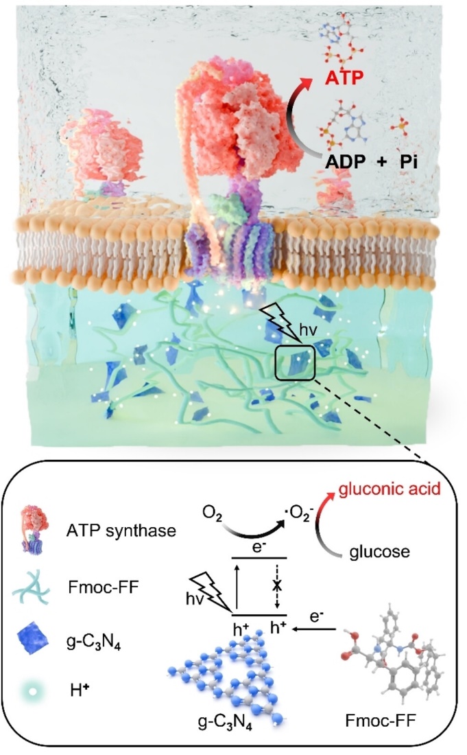 李悦/李自博课题组构筑了一种二肽水凝胶支撑的ATP合酶组装体系,通过预先包埋g-C3N4纳米片于Fmoc-FF水凝胶,利用二者协同的电子耦合效应,在水凝胶内外构造光控的质子梯度,用于驱动ATP合酶催化生成ATP(图 1)。极细的纳米纤维为g-C3N4超薄纳米片提供了良好的分散位置,有效提升了体外光合磷酸化效率,拓宽了二肽水凝胶在仿生器件领域的实际应用。相关研究”A well-coupled supramolecular system accelerates photophosphorylation”发表于国际学术期刊Angewandte Chemie International Edition(2025,e202417474)。此项研究工作得到了国家自然科学基金重大项目、国家自然科学基金青年项目、科技部重点研发计划的支持。论文第一完成单位为性爱网站