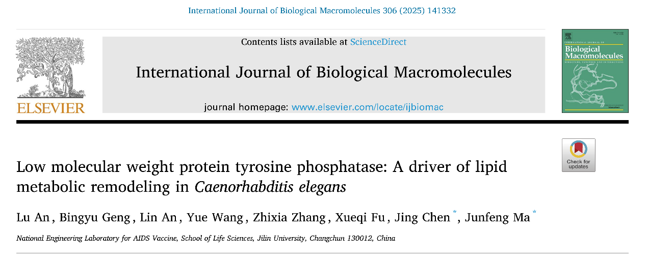 该成果以《Low molecular weight protein tyrosine phosphatase: A driver of lipid metabolic remodeling in Caenorhabditis elegans》为题,发表于国际学术期刊International Journal of Biological Macromolecules。此项研究工作得到了国家自然科学基金、国家重点研发计划以及吉林省科技发展项目的支持。论文的完成单位为性爱网站