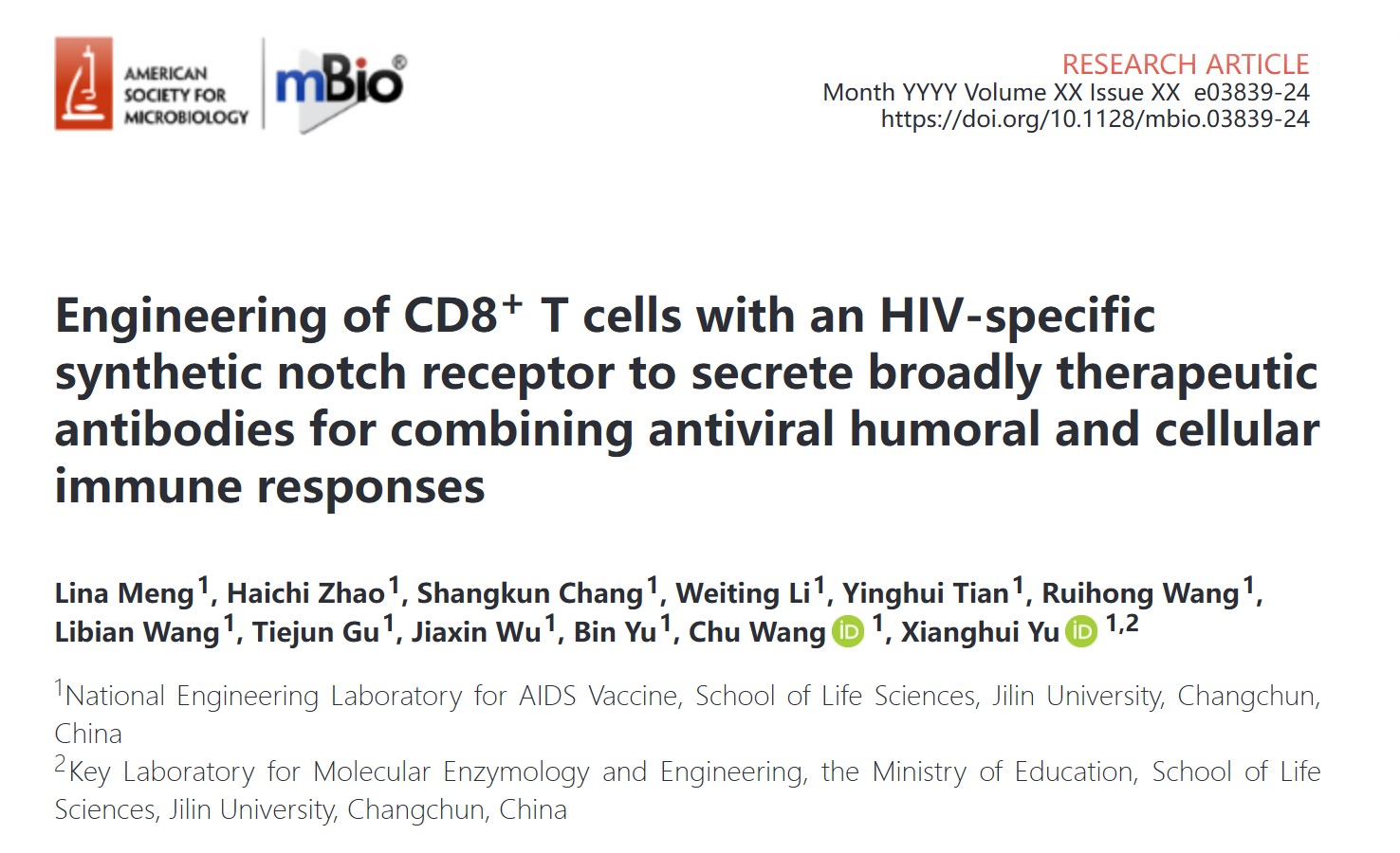 艾滋病疫苗国家工程实验室于湘晖教授和王储副教授团队于2025年2月在《mBio》杂志在线发表了题为“Engineering of CD8+ T cells with an HIV-specific synthetic notch receptor to secrete broadly therapeutic antibodies for combining antiviral humoral and cellular immune responses.”的工作。该研究利用能够对细胞功能进行自由定制的synNotch受体技术改造人CD8+ T细胞,使其在特异性识别病毒抗原后,可控地分泌bNAb和双特异性T细胞衔接蛋白(BiTE),创新性地赋予CD8+ T细胞同时发挥抗HIV广谱中和作用和细胞杀伤作用的双重能力,从而达到直接中和游离病毒以及介导T细胞靶向杀伤病毒感染细胞这两种目的。这种新型双功能T细胞集成了治疗分子bNAb和BiTE的局部和系统性抗病毒效应,对病毒潜伏感染细胞具有显著清除效果,有潜力成为未来临床治疗HIV感染的有效候选策略。