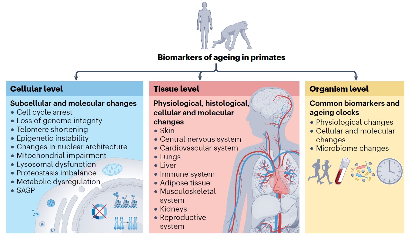 、中国科学院动物研究所、中国科学院北京基因组研究所等多家单位的研究团队联合中国衰老标志物研究联合体(Aging Biomarker Consortium,ABC)多位学者,全面总结了人类与非人灵长类在细胞、组织和个体水平上的衰老生物标志物,为理解、评估和干预衰老提供了多层次、系统性的科学框架。研究成果以“Biomarkers of ageing of humans and non-human primates”为题,于9月11日发表在Nature Reviews Molecular Cell Biology杂志。