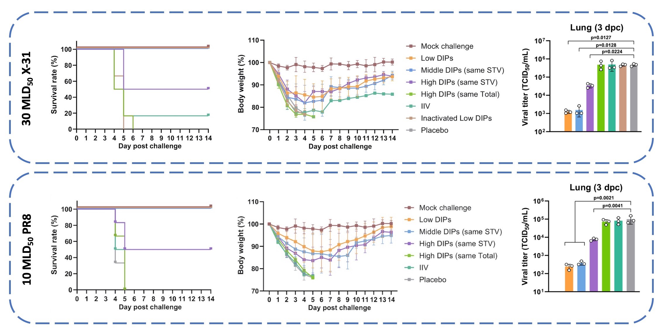 基于低DIPs LAIV的复制优势与独特的抗原提呈优势,其诱导的呼吸道黏膜分泌型IgA、血清IgG及中和抗体滴度均显著高于高DIPs LAIV组,且中和抗体持久性更强,能够广泛中和多种H3N2和H1N1毒株。小鼠攻毒实验进一步验证了其保护效果:低DIPs LAIV和中DIPs LAIV对高致死剂量H3N2同源毒株及异源H1N1和H1N1pdm09毒株的攻毒均能提供完全保护,肺组织病毒载量很低,肺部病理损伤微弱,显著优于高DIPs LAIV与灭活疫苗。