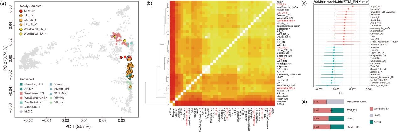 图2 .古代人群遗传结构分析。(a)本研究分析的 42 名古人类个体的主成分分析;(b)来自高纬度地区(蒙古和南西伯利亚)和中国北方(AR、WLR 和 YR)的古代人群的成对的外群-ƒ3 统计值;(c)通过 ƒ4计算 STM_EN 与 Yumin之间的遗传差异;(d)qpAdm 分析显示目标群体中每个祖先来源成分的比例