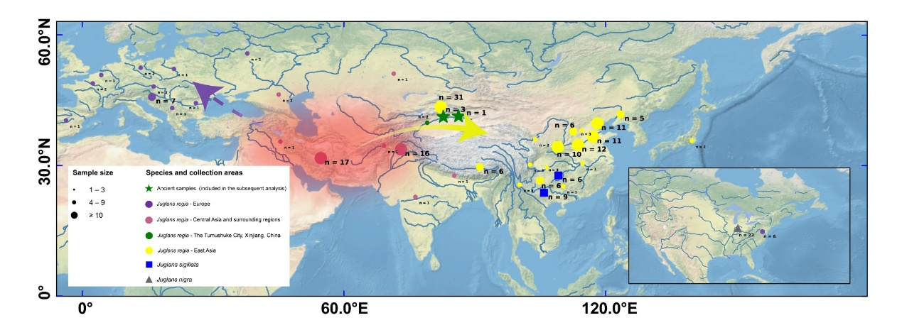 图.地图上展示了本研究利用的古代和现代核桃及铁核桃的采样位置及样本数量。箭头代表推测核桃的传播路线。