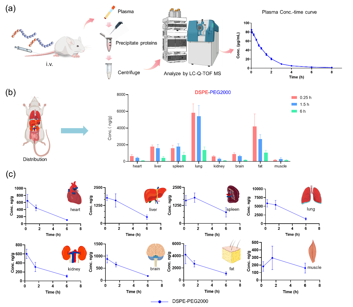 图2. DSPE-PEG2000在大鼠体内的血浆药时曲线及组织分布情况。