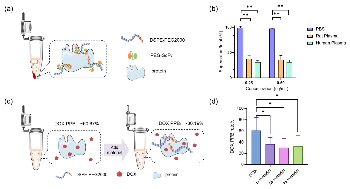 图3. DSPE-PEG2000的血浆蛋白结合率及其对DOX的血浆蛋白结合率的影响
