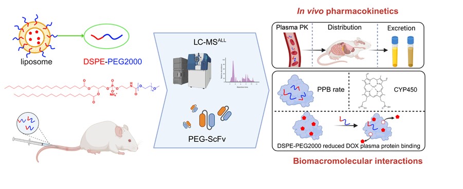 DSPE-PEG2000是PEG化长循环纳米药物核心辅料,长期被视作生物惰性材料,但受分析技术限制,其体内行为与生物相互作用长期未被明确解析。团队创新融合LC-Q-TOF MS与PEG-scFv 技术,攻克聚合物类辅料体内精准分析难题,搭建高效的体内全轮廓分析体系。