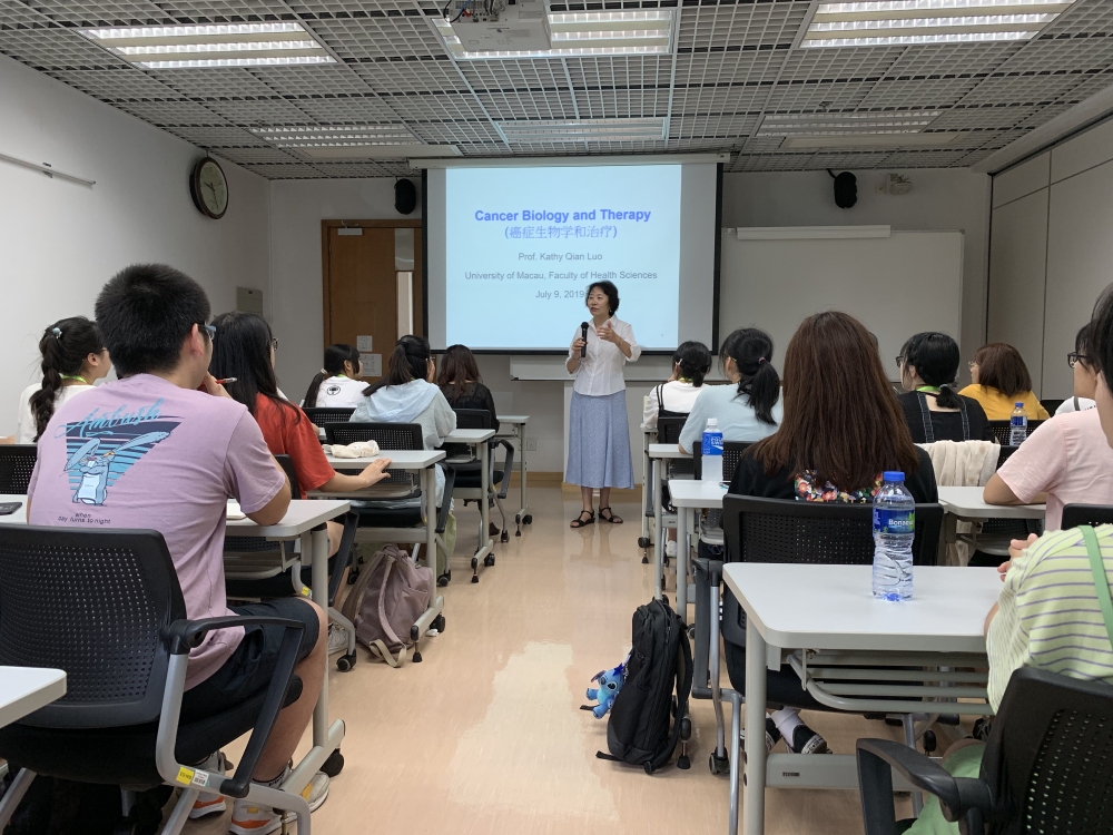 在澳门大学学习期间,主办方精心安排的生物医学讲座给大家留下了深刻的印象。邓初夏教授以“精准医学的挑战与机遇”为主题深入浅出的讲解,让同学们对精准医学领域有了更为深刻的体会,感受到量身定做的个性化治疗方案对于癌症病人生活质量改善的意义所在。徐仁和教授致力于干细胞和再生医学的研究,研究兴趣包括探索EMSCE的新型治疗应用,在各种病理条件下阐明EMSC在宿主中的命运、解决hESC衍生的同种异体移植物的免疫原性和生物安全性问题。罗茜教授主要为大家讲解了十大癌症的特征表现,如避免免疫破坏、激活侵袭和转移、肿瘤促进炎症等,此外还研究循环肿瘤细胞如何在循环中存活并获得转移能力,并针对提出不同对付癌细胞转移的策略。王山鸣教授介绍了其课题组目前进展课题,通过scRNA-Seq定义乳腺癌异质性;使用ChIA-PET和Hi-C对癌细胞进行3D染色质分析;通过图像质量细胞计数对肿瘤免疫微环境的高维分析。报告后,参会师生从不同角度提出了问题,并与教授进行了热烈的讨论和交流,现场气氛热烈,与会的广大师生受益匪浅。