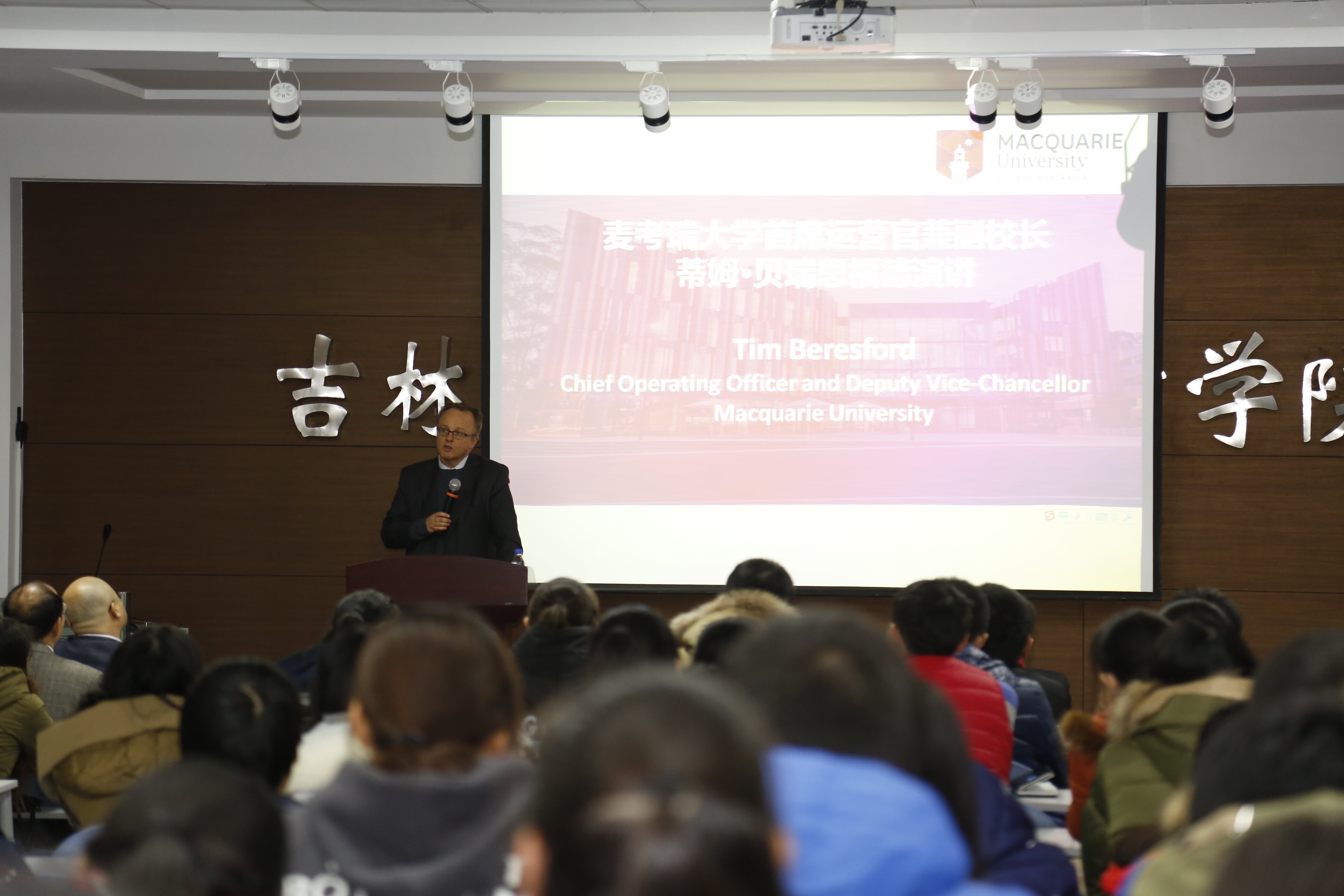 和麦考瑞大学密切合作的良好关系,之后对麦考瑞大学的情况进行了简单介绍,并在两校未来合作及领导力方面做了详细阐述,最后以对学生的寄语“海阔凭鱼跃、天高任鸟飞”结束了此次演讲。