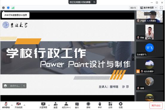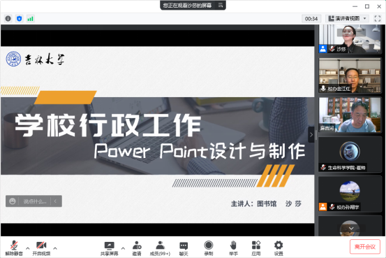 行政管理干部业务工作能力,努力打造“一流”行政管理干部队伍,有力推动服务生物学学科建设和学院发展,6月4日晚,学院组织全院行政管理干部参加了由学校党委办公室、校长办公室联合举办的“机关管理服务效能提升微课堂”。线上学习了由学校图书馆信息素养课堂主讲教师沙莎讲授的“学校行政工作Power Point设计与制作”主题微课。