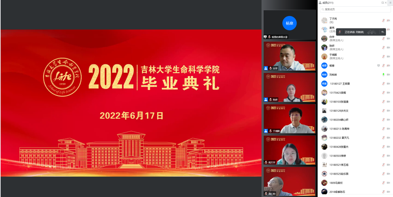 院长于湘晖在毕业寄语中,首先带领师生回顾了几年来学院飞速发展的骄人成绩,并对广大毕业生提出四点希望:一是要赓续使命,以实际行动践行榜样精神。在习近平总书记对黄大年同志先进事迹作出重要指示五周年之际,作为生命科学领域的科研攻坚者,要弘扬和践行黄大年精神,将个人的成长成才融入到国家科技强国对于人才的迫切需求之中。二是要矢志不移,在青春的赛道上跑出好成绩。在中国全面实施创新驱动发展战略和健康中国战略的今天,要有咬定青山不放松的韧性,坐得住冷板凳,吃得下冷餐饭,发展成为基础研究拔尖创新人才,发展成为面向社会需求的复合型人才。三是要学以养德,坚守历久弥新的文明耐力。要明辨道德判断,以敏锐的道德判断在成长发展的轨迹上守住人生的底线;要涵养道德自觉,以根植于内心的道德自觉做一个对社会有意义、有贡献的人,一个散发光芒和力量的人;要笃定道德坚守,以高尚的道德坚守实现人生价值的升华。四是要脚踏实地,传承生生不息的生科血脉。要始终坚持“四个面向”,把握科技创新大势,深耕优势领域,做扎根中国大地、奋战科研一线的卓越生物学人才,在民族复兴的伟大事业中,在实现个人远大理想抱负中,大显身手、大有作为,以骄人的成绩伴随母院共赴辉煌!