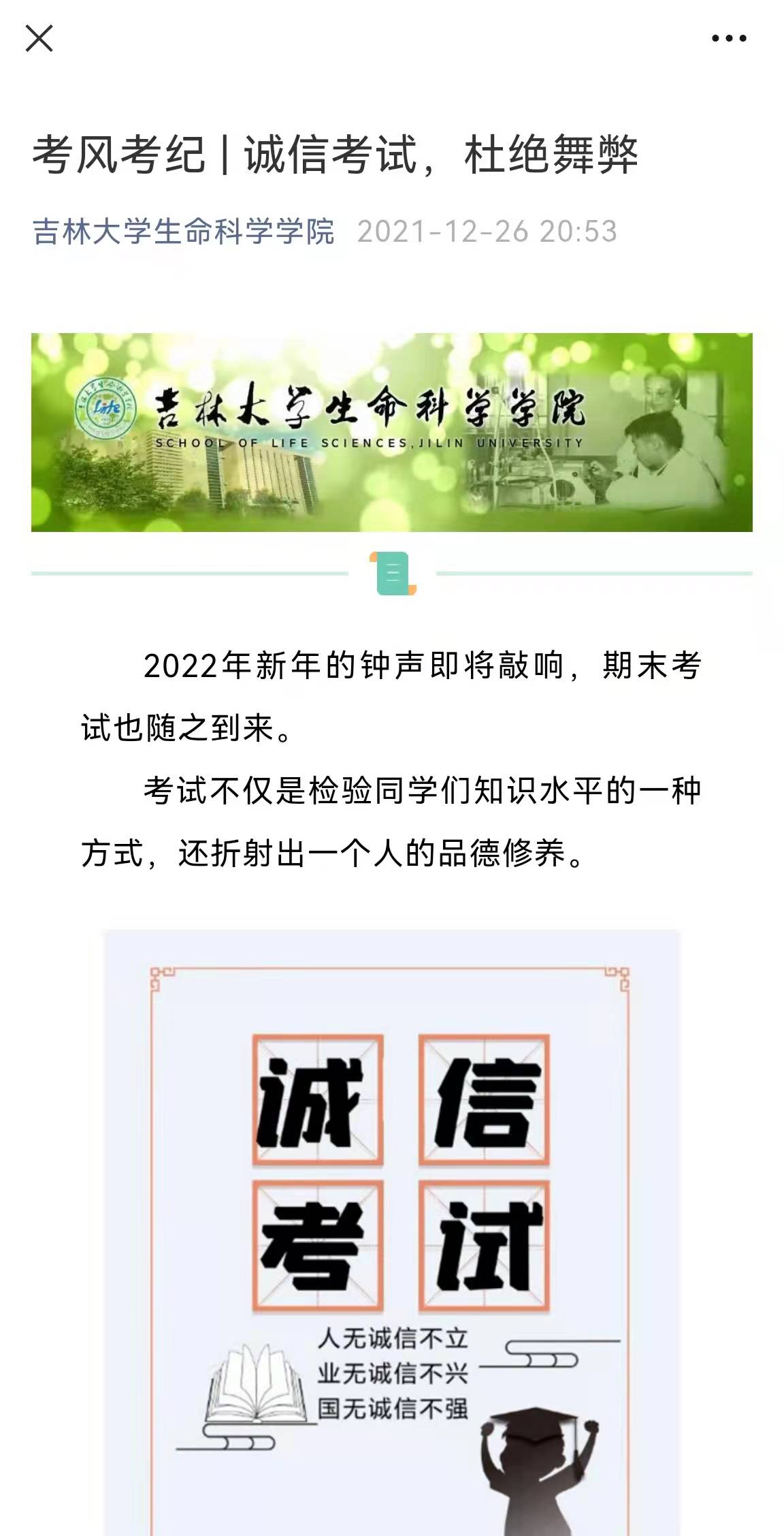 2021年12月26日,院学工办在学院公众号上发布了《考风考纪|诚信考试,杜绝舞弊》的推送,倡导优良学风与诚实诚信,并分年级召开了诚信考试教育动员会,要求全体学生严格遵守考试纪律,做到诚信应试,同时组织全体学生签订了《性爱网站