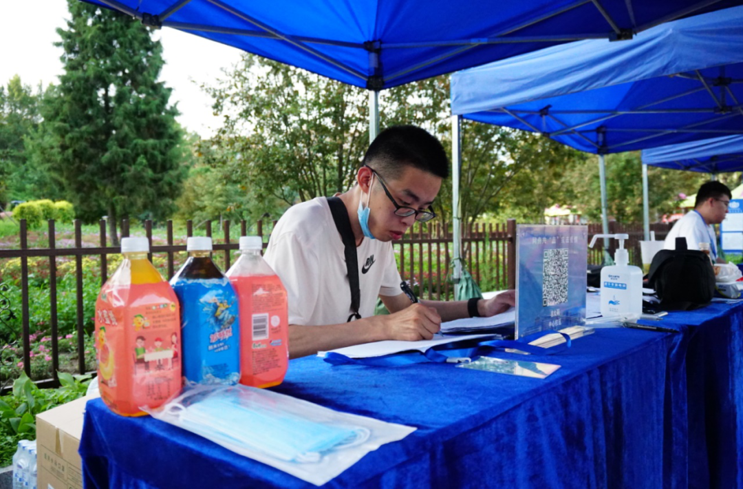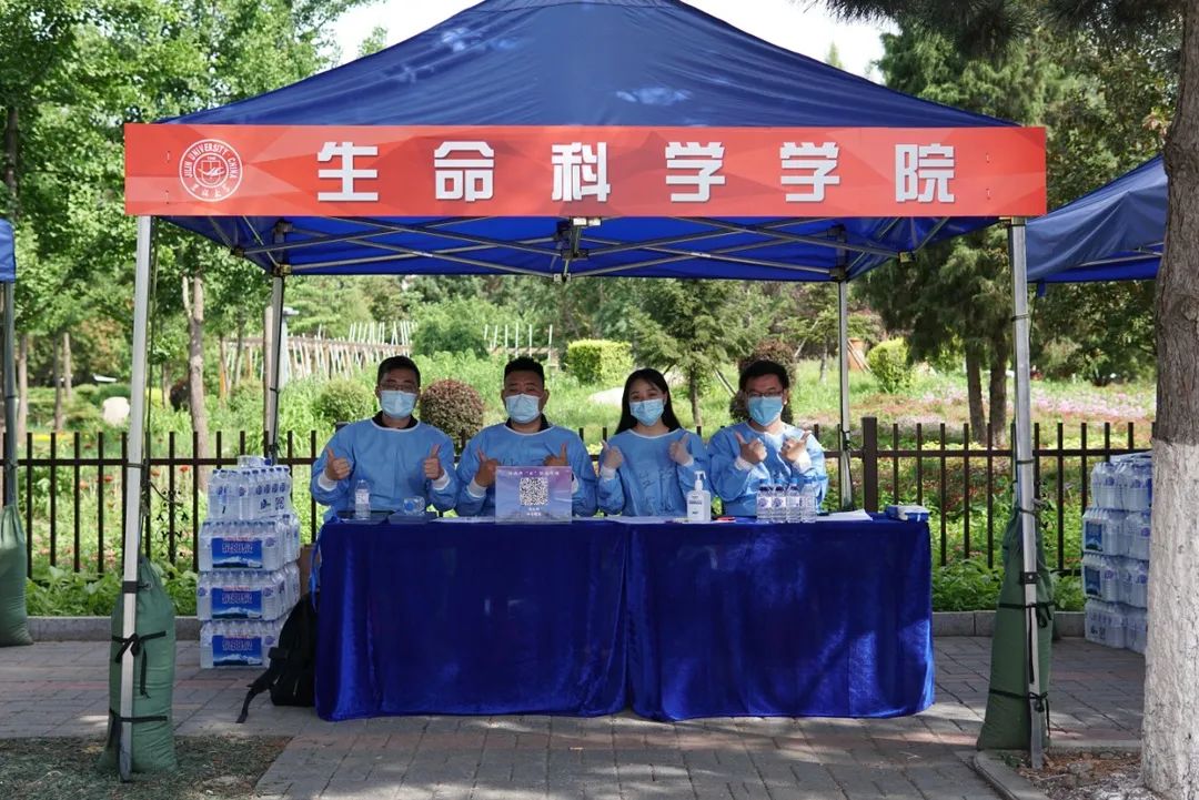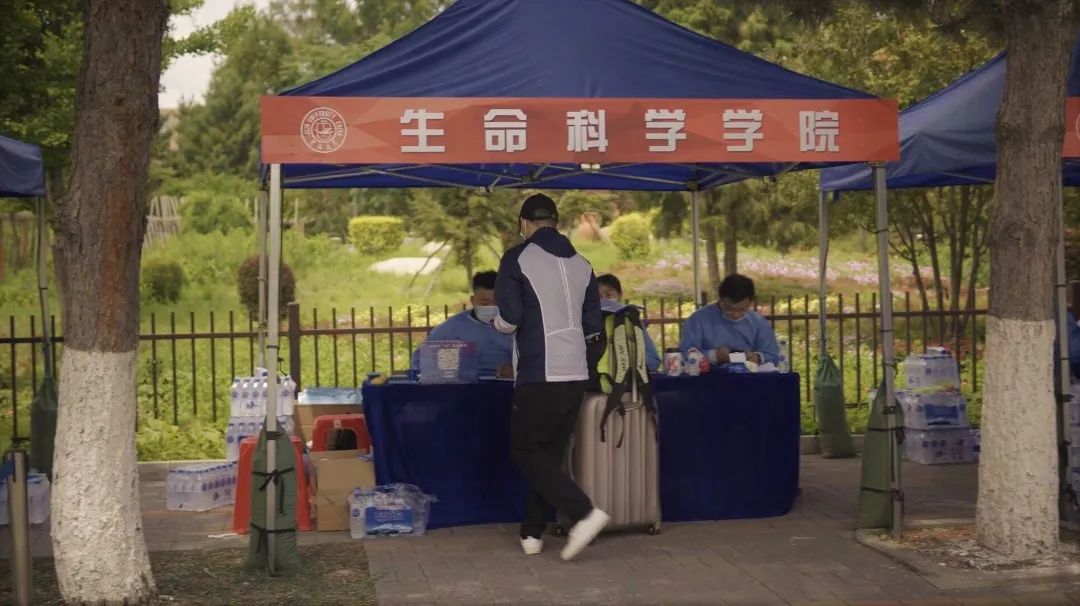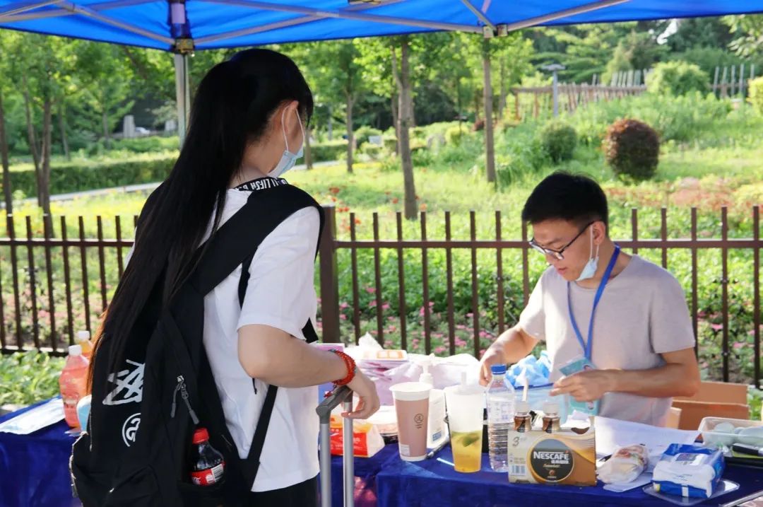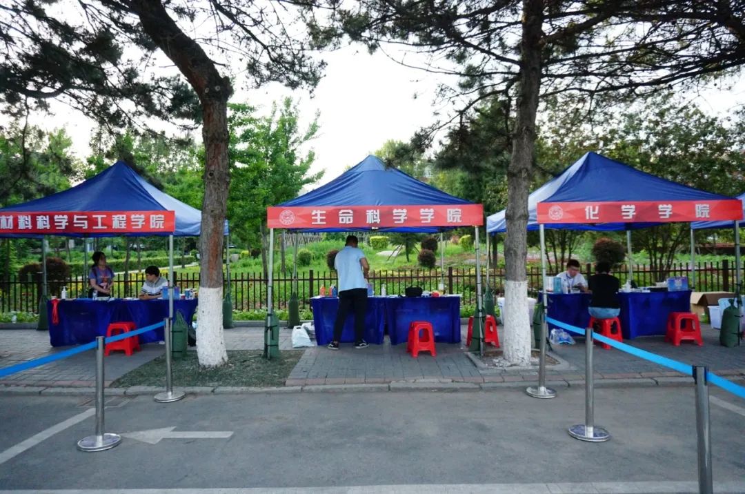 学院党委副书记崔帅、2016级辅导员马莹、2019级辅导员齐鹏、辅导员刘春天四位老师早早地就在北门搭起了接待棚