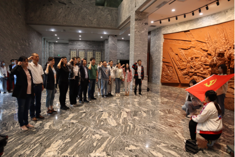“我志愿加入中国共产党......随时准备为党和人民牺牲一切,永不叛党”。纪念馆门口,是一面庄严肃穆的纪念石壁,在鲜红的党旗下全体党员跟随邹丽云老师一起重温了入党誓词,字字句句,铿锵有力,饱含着对革命先烈的敬重与钦佩,诉说着青年学子对继承英雄遗志投身祖国建设的郑重承诺