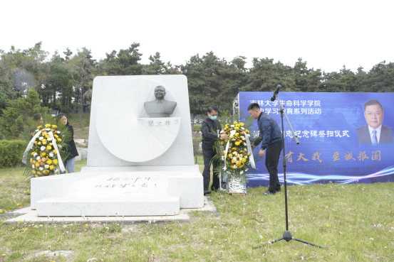 上午9时30分,祭扫活动开始。正值此时,细雨飘洒,苍松翠柏掩映下黄大年同志纪念碑圣洁而肃穆。学院师生在纪念碑前整齐列队,静默肃立。教师代表向黄大年同志纪念碑敬献花篮,全体师生行鞠躬礼,寄托崇敬。教师代表金英花敬读黄大年同志纪念碑文,“五十八载春秋,矢志振兴中华;百千万里征程,不畏山高路长。永言景行,常志夙心,颂其邵德,鉴其鸿愿。斯人虽逝,福荫久远,大年精神不朽;音容犹存,德泽绵延,黄公美名长青。”黄大年同志卓越而伟大的一生用文字镌刻在了纪念碑上,更拓印在人们心里。