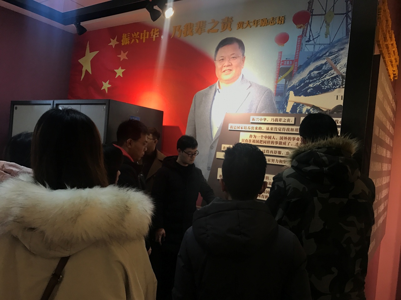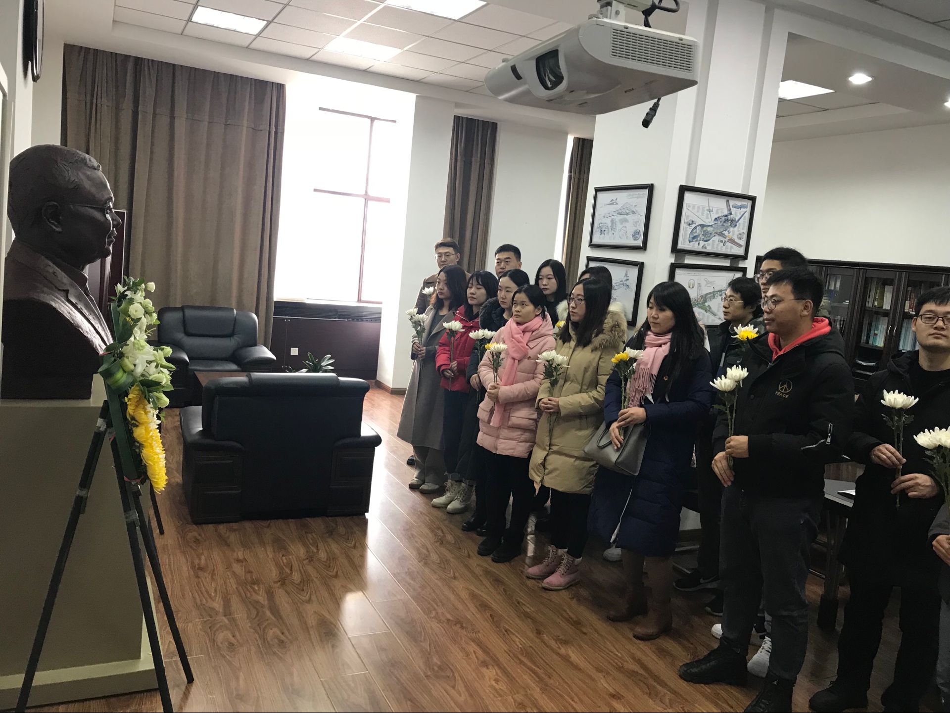 朝阳校区,保留了黄大年老师的办公室的原貌,展示了他生前获得的荣誉证书、参加国家会议的证件、部分药品和生活用品、以及珍贵的科研手稿文件,这些都是黄大年教授为科研事业奉献一切、为祖国不懈奋斗的最好证明。党员们怀着敬慕之情,仔细地参观了大厅内摆放的展览品,详细了解了黄老师的研究内容与科研成果。展厅参观结束后,每一个党员都站在黄大年教授的雕塑前,列队向黄大年教授致敬并献花,表达对他的沉痛的悼念。