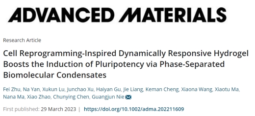 杰出校友、国家纳米科学中心聂广军团队在Advanced Materials 期刊发表了题为:Cell Reprogramming-Inspired Dynamically Responsive Hydrogel Boosts the Induction of Pluripotency via Phase-Separated Biomolecular Condensates 的研究论文。